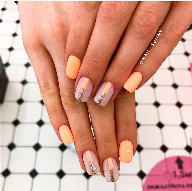 - Прекрасно оттеняют апельсиновый дизайн ногтей и добавляют интригующего мерцания золотистые или серебристые блестки, нанесенные поверх основного цвета лака.