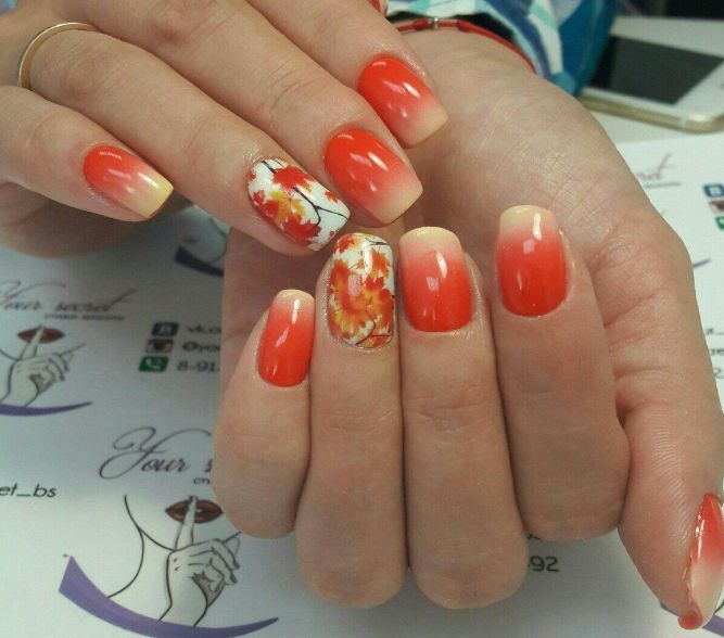 Очень актуально и свежо выглядит градиентный дизайн ногтей. Он заключается в создании плавных переходов от одного оттенка к другому. Идеальным сочетанием в данном случае станет маникюр в оранжево-красной цветовой гамме. Эти яркие и насыщенные оттенки плавно переходят друг в друга и прекрасно гармонируют.