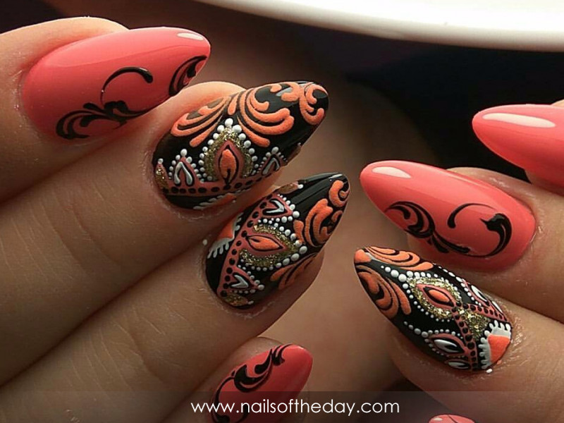 Сочетание черного и оранжевого заслуживает того, чтобы мы поговорили о нем подробнее, ведь это самое оригинальное решение, которое можно придумать с насыщенным морковным цветом. Черный цвет в этом тандеме играет роль контраста и используется для обводки и акцентирования рисунка. Сочетание этих двух противоположных цветов открывает дорогу сотням оригинальных идей для нейл-артов. Так черный может использоваться для прорисовки цветочных орнаментов, линий, полосок, точек и узоров, животных, символом и даже надписей. Не менее стильно будет выглядеть простой дизайн в черно-оранжевом цвете без узоров, где каждый ноготок окрашен в контрастный цвет.