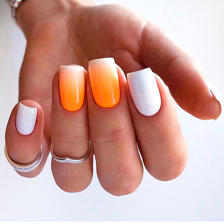 Стильно и жизнерадостно будет смотреться градиентный маникюр с плавным переходом от светлого, почти желтого оттенка к более темному оранжевому или насыщенному коралловому. Можно сделать градиент от пальчика к пальчику либо выполнить омбре на каждой ногтевой пластине.