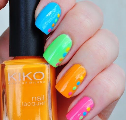 Каким бы разноцветным маникюр не был, в большинстве случае, в его цветовой гамме обязательно будет присутствовать зеленый цвет того или иного оттенка. Самым распространенным разноцветным дизайном является окрашивание отдельных ноготков в разные цвета. Также можно сделать разноцветный градиент.