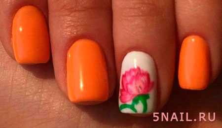 - Оранжевый френч с заметным акцентом в форме изящного цветка;