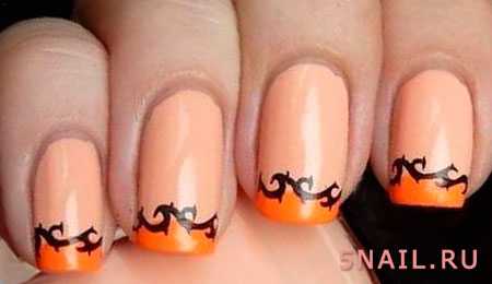 Оранжево-черный маникюр – это прекрасное решение, ведь такое сочетание цветов по праву считается идеальным. Чтобы получить прекрасный результат, можно использовать оранжевый лак в качестве основы, а черным покрытием нанести интересный узор. При этом безымянный палец смело можно выделить – к примеру, сделать черный цвет основным, а с помощью оранжевого оттенка нанести рисунок.