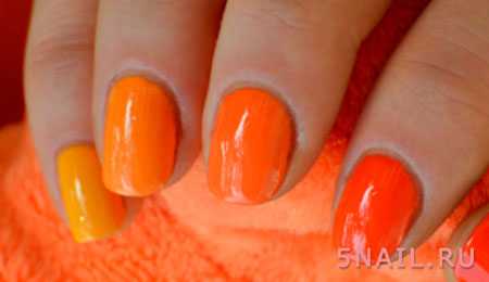 - Желто-оранжевый. Этот оттенок также нельзя ни с чем перепутать. Роскошно смотрится такой цвет в градиентном маникюре. Он позволяет создавать просто космические сочетания и переходы. Ни одна модница точно не останется равнодушной.