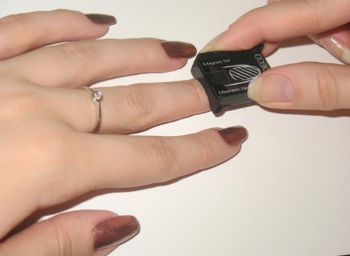 Пользоваться магнитными лаками нетрудно. Наносим на ноготь, прикладываем пластинку – и все готово. Только ноготки покрываем лаком аккуратно – вот и все требования. Накладываем вначале один слой, более тонкий, затем, немного погодя, наносим второй.