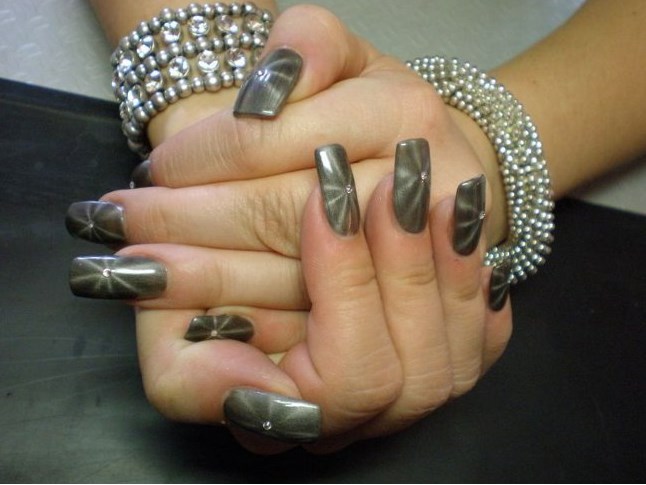 Различные модели магнита создают разный эффект, что позволяет магнитному нейл-арту выглядеть привлекательно и гламурно. Даже если вы не используете магнит, ваши ногти после нанесения магнитного гель-лака будут выглядеть яркими и мерцающими. Магнитный маникюр можно украшать стразами, жидкими камнями, блестками и другими аксессуарами для ногтей.
