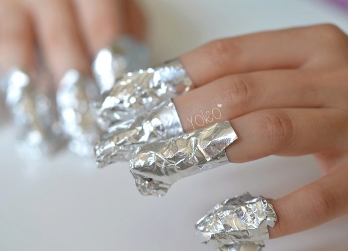 Чтобы сделать твердый слой геля более податливым, необходимо обильно смочить вату в средстве для снятия гель-лака и обернуть вокруг ногтя. Сверху вату лучше всего укрыть фольгой, чтобы создать эффект парника. Держать такой компресс на ногтях нужно не менее 10–15 минут.