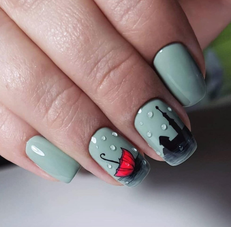 Поскольку осенью погода всегда пасмурная и дождливая, а зонтики являются обязательным атрибутом для многих женских образов, дизайнеры предлагают использовать эту функцию для создания модного нейл-арта, который становится одним из вариантов модных тематических рисунков нейл-арта. Различные изображения зонтиков особенно красиво сочетаются с каплями дождя, которые можно нарисовать на основании ногтей в той же технике, что и сами зонтики, или сделать из прозрачного акрила, чтобы они выглядели «настоящими». Используйте плавный переход градиента в качестве основы для этого рисунка «дождь», который особенно красиво смотрится в сочетании с прозрачными каплями воды или матовым топом