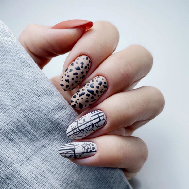 Осенью 2021 года в моде будет маникюр с анималистическими принтами, прежде всего, это касается изображения хищных животных. Рисунки могут наноситься как на весь ноготь, так и частично.