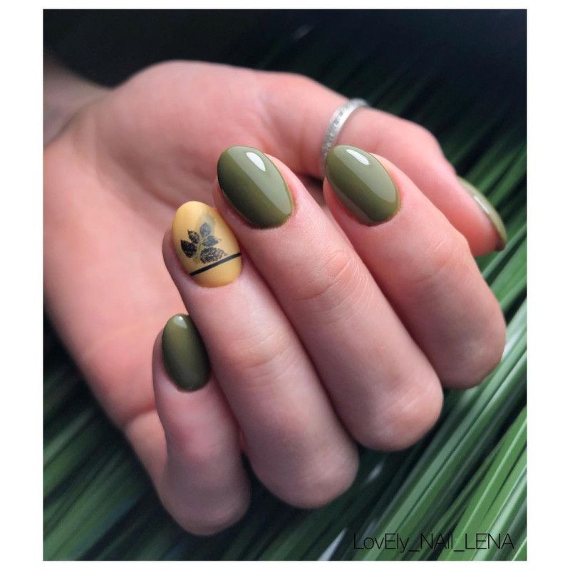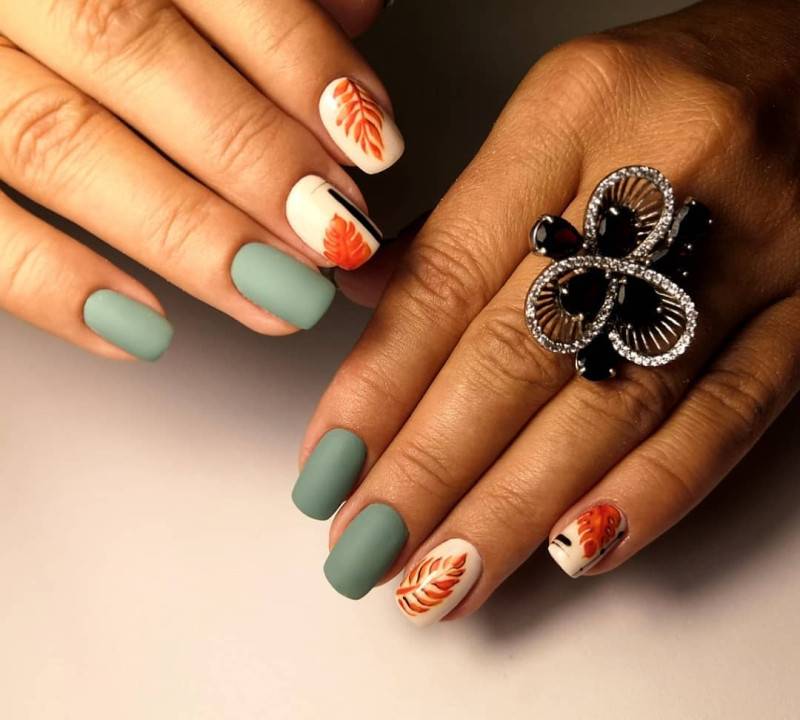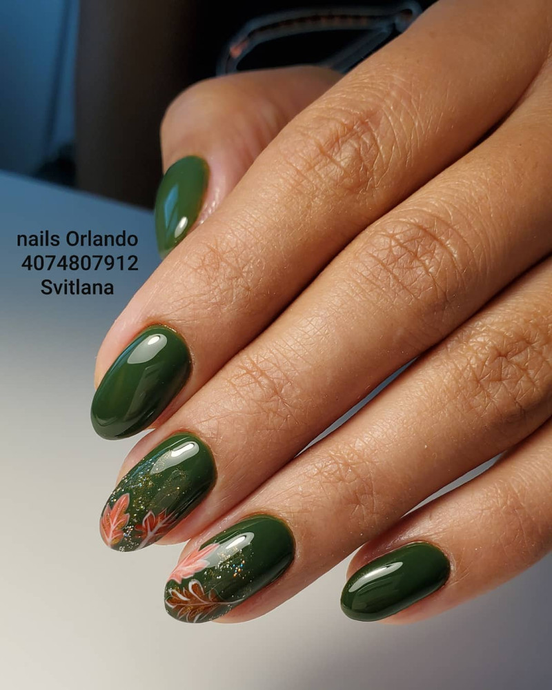 Зеленый цвет действует умиротворяюще на человека, глядя на этот цвет мы успокаиваемся, в нас просыпается вдохновение. Этот цвет имеет множество оттенков, среди которых найдется идеальные экземпляры, как для летнего, так и для осеннего маникюра. В данном случае уместно будет говорить про глубокие, насыщенные зеленые цвета, например, идеальным вариантом станет изумрудный или маникюр цвета хаки. Приятным бонусом также является то, что на зеленом фоне отлично выделяются осенние листья желтого, оранжевого и даже бордового цвета. Нотка золотого песка в этом дизайне не помешает.