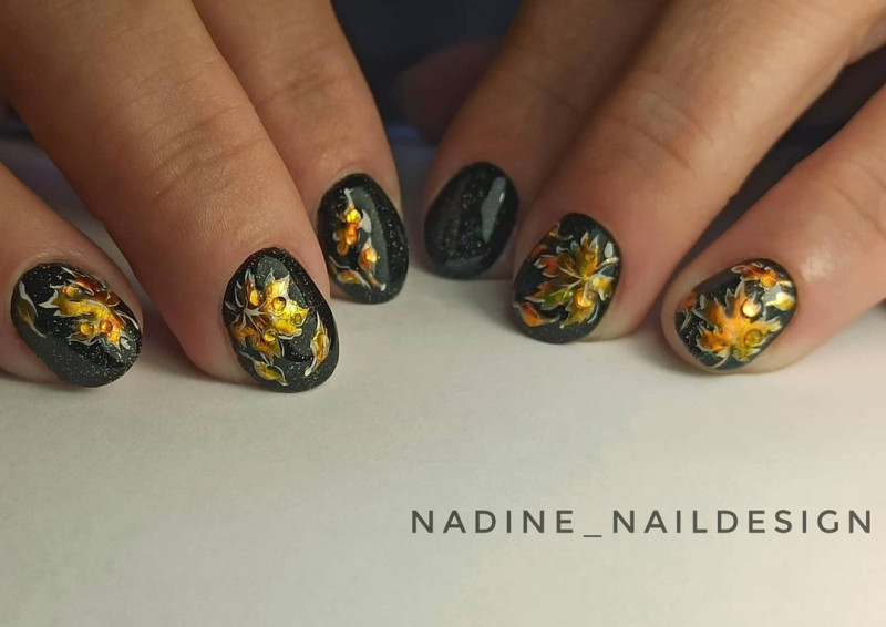 Золото в черном осеннем маникюре
