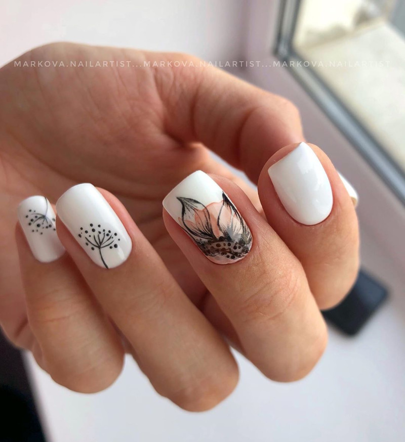 Еще одна красивая идея – покрыть все ногти одним цветом, а безымянный оставить прозрачным и нанести на него рисунок цветка или веточки. Наиболее актуальными оттенками являются синий, кофейный, оливковый и красный.