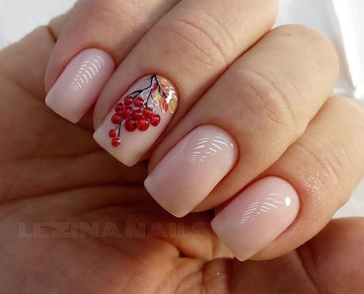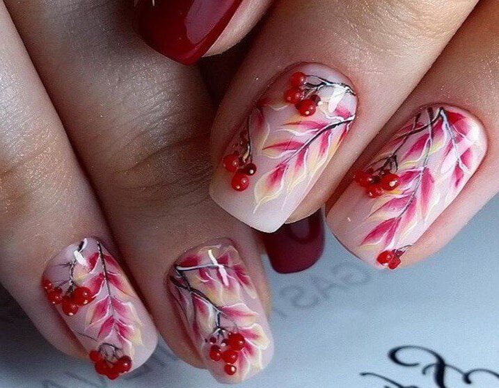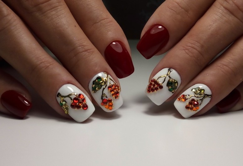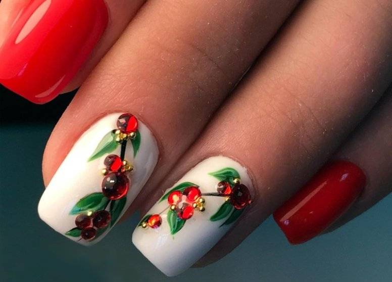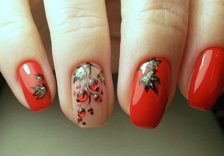 Для любителей флористики, предлагаю не зацикливаться только на цветочках, да листочках, а вспомнить и о фруктах и ягодках. Например, маникюр с рябиной, обычный или украшенный стразиками будет очень оригинально выглядеть.