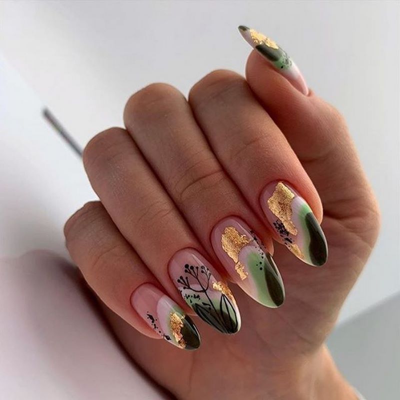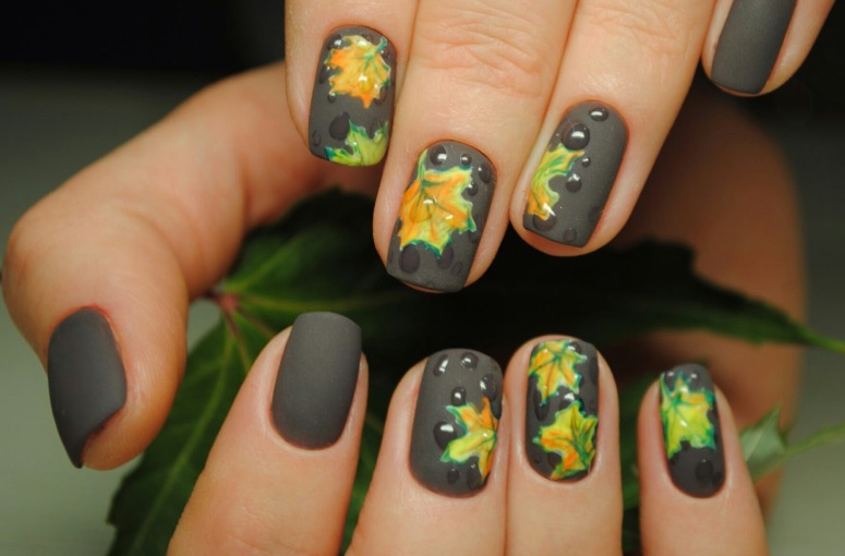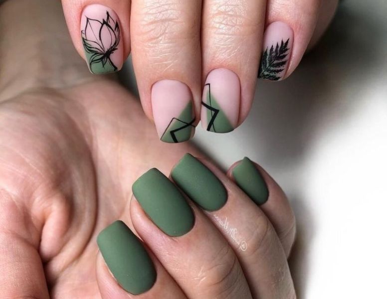 Зеленый цвет действует умиротворяюще на человека, глядя на этот цвет мы успокаиваемся, в нас просыпается вдохновение. Этот цвет имеет множество оттенков, среди которых найдется идеальные экземпляры, как для летнего, так и для осеннего маникюра. В данном случае уместно будет говорить про глубокие, насыщенные зеленые цвета, например, идеальным вариантом станет изумрудный или маникюр цвета хаки. Приятным бонусом также является то, что на зеленом фоне отлично выделяются осенние листья желтого, оранжевого и даже бордового цвета. Нотка золотого песка в этом дизайне не помешает.