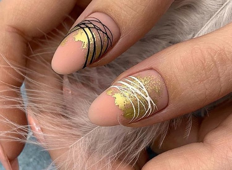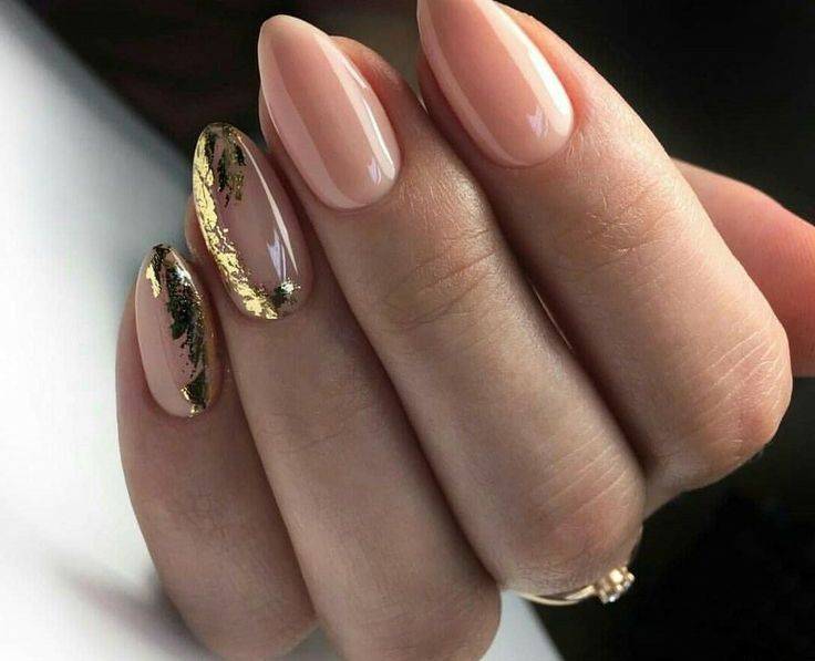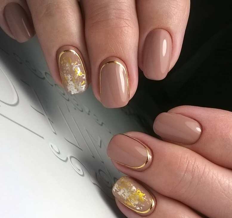 Ноготки в нюдовых тонах с золотой фольгой выглядят лаконично и стильно. Главное не переборщить с золотом.