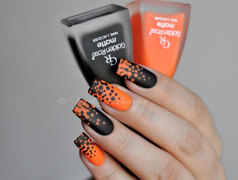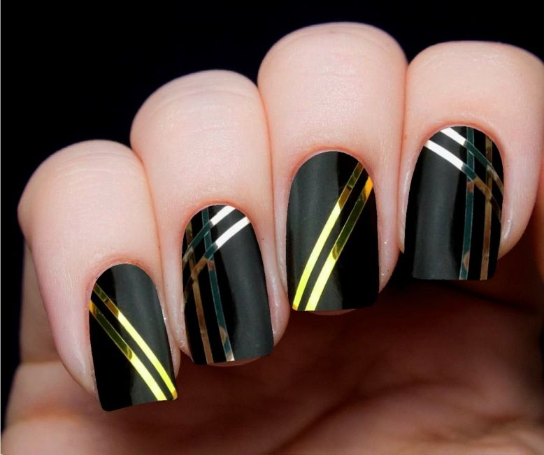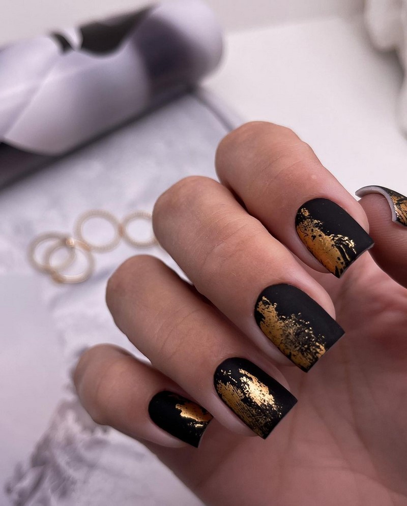 Черный маникюр с золотистым декором всегда смотрится загадочно и шикарно. Для получения еще большего эффекта рекомендуется использовать матовую основу и негативное пространство.