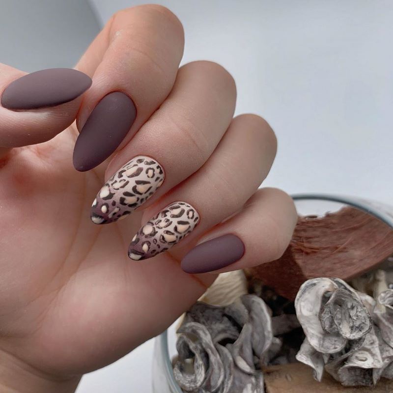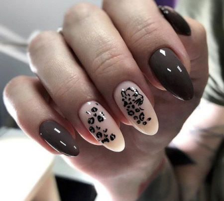 Осенью 2021 года в моде будет маникюр с анималистическими принтами, прежде всего, это касается изображения хищных животных. Рисунки могут наноситься как на весь ноготь, так и частично.