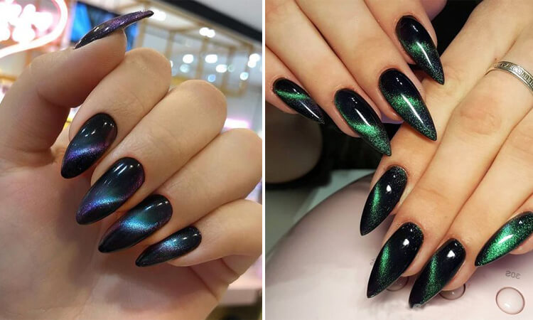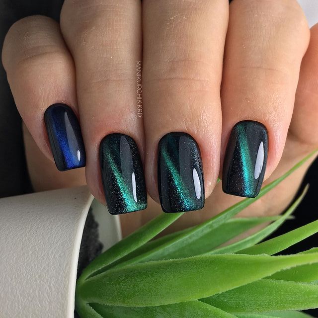 Этот эффект делается с помощью специального магнита. «Кошачий глаз» не всегда украшает каждый палец. Такой вариант можно выбрать в качестве украшения в стиле фэн-шуй, подчеркнув один или два ногтя. Также он хорошо смотрится в ансамбле с другими украшениями. Одним из популярных решений является изумрудная втирка. Но в этом случае покрытие необходимо наносить на разные ногти.