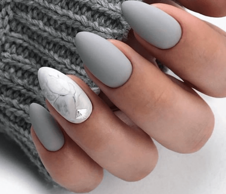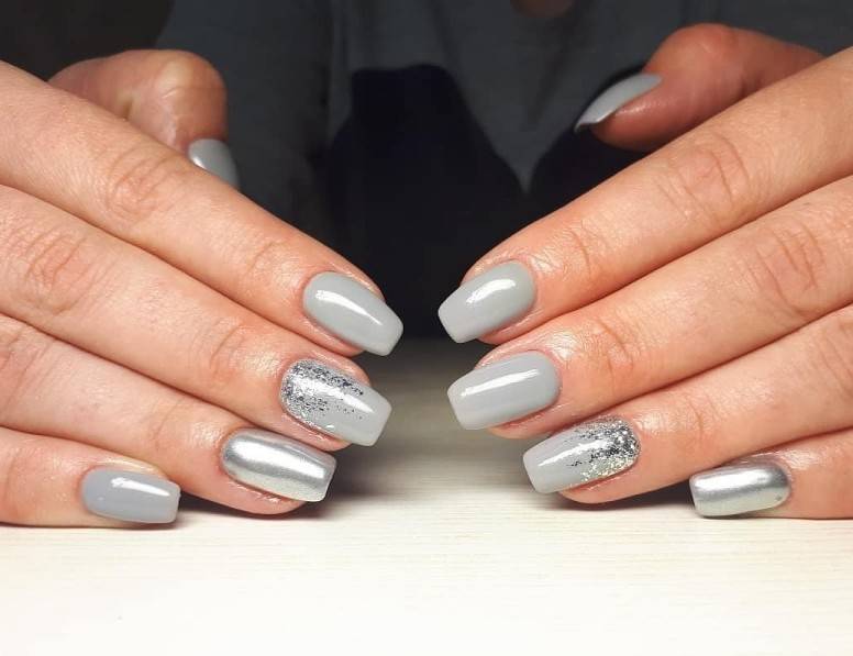 Нежный серый цвет на всех пальчиках, но на одном из них рисунок имитации мрамора или металлический ноготок.
