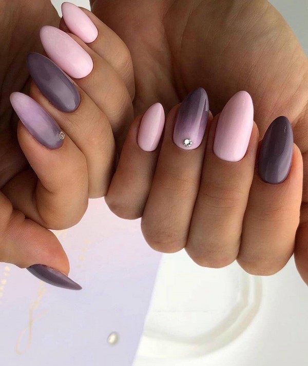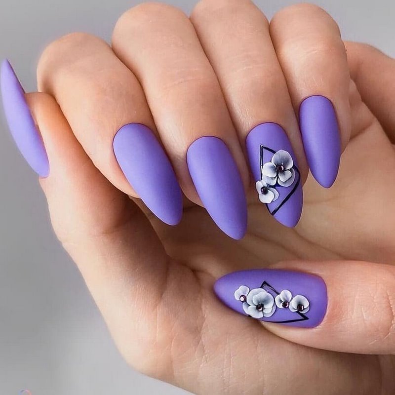 - Глубокий фиолетовый – веселый и яркий цвет, который особенно выделяется осенью, эффектно смотрится как на коротких, так и на длинных ногтях.