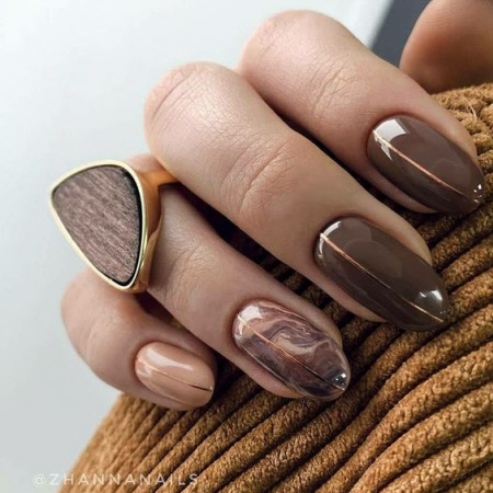 - Теплый шоколадный оттенок ногтей будет отлично смотреться с уютными шерстяными изделиями и отлично дополнит ваш осенний образ.