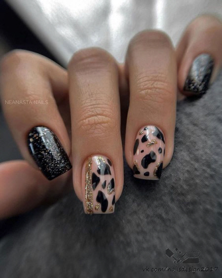 Это очень смелый дизайн. Главное правило: основа должна быть нюдовая. Так ногти не будут выглядеть вульгарно. Светло-розовая основа с добавлением золота и леопардового принта – хит осеннего сезона.