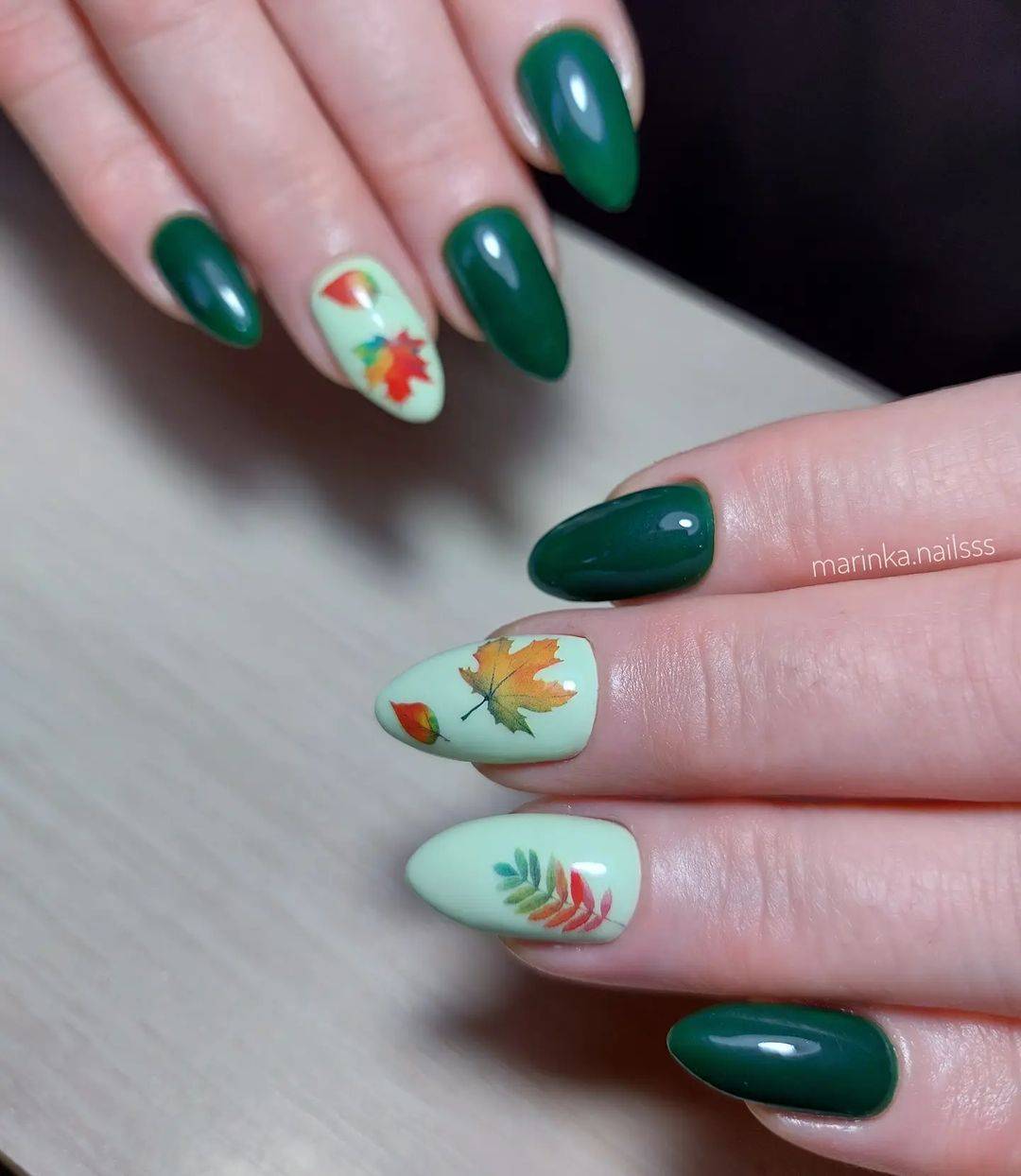 Зеленый маникюр с осенними листьями