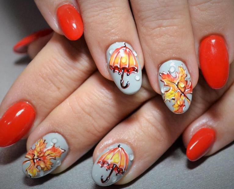 Поскольку осенью погода всегда пасмурная и дождливая, а зонтики являются обязательным атрибутом для многих женских образов, дизайнеры предлагают использовать эту функцию для создания модного нейл-арта, который становится одним из вариантов модных тематических рисунков нейл-арта. Различные изображения зонтиков особенно красиво сочетаются с каплями дождя, которые можно нарисовать на основании ногтей в той же технике, что и сами зонтики, или сделать из прозрачного акрила, чтобы они выглядели «настоящими». Используйте плавный переход градиента в качестве основы для этого рисунка «дождь», который особенно красиво смотрится в сочетании с прозрачными каплями воды или матовым топом