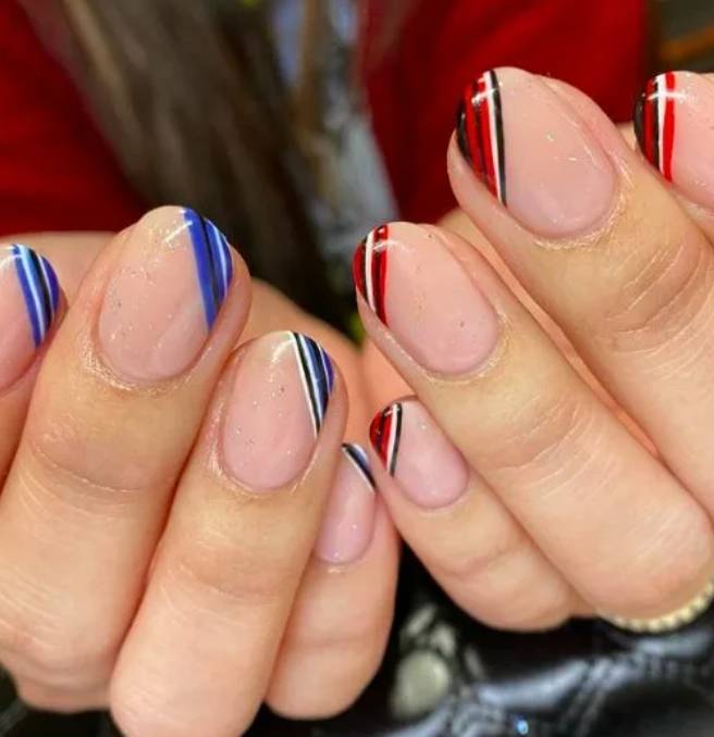 Осенью 2023 года такой вариант дизайна займет лидирующие позиции в списке модных трендов. На ноготках рисуют полоску, которая чем-то напоминает морскую волну. Ее можно расположить как у основания ногтя, так и на кончике, а в качестве декора использовать фольгу, камни, стразы, скотч-ленты или добавить рисунки.