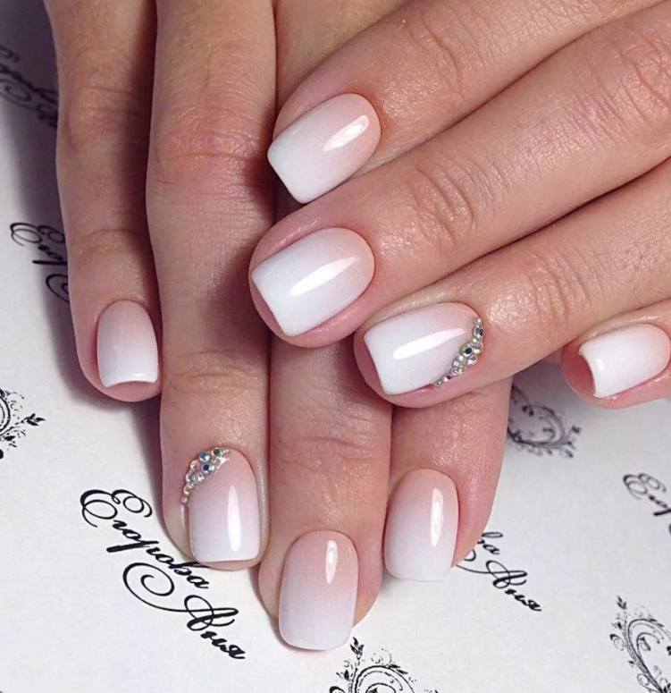 - свадебный френч. Милый вариант для того, чтобы подчеркнуть нежно-непорочный образ невесты. Выигрышно смотрится с узором на безымянном пальце, раскрывающим многогранность блеска заветного колечка;