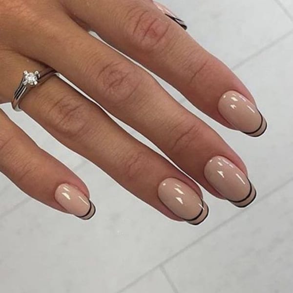 Такой вариант френча смотрится очень аккуратно и нежно. Ему отдают предпочтение любительницы минимализма. Тонкие линии мастера обычно наносят от руки кисточкой, но можно использовать скотч-ленты. Дизайн подойдет дамам любого возраста. Его все чаще выбирают на осень студентки, школьницы и офисные работницы.