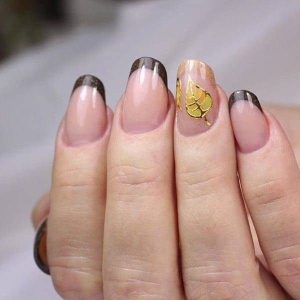 Не иссякающий модный тренд – это френч, который может стать отличной базой для создания осеннего маникюра. Как вариант, может использоваться классический френч с нюдовым окрасом и белым кончиком ногтя. На таком фоне можно создать уникальный осенний дизайн.