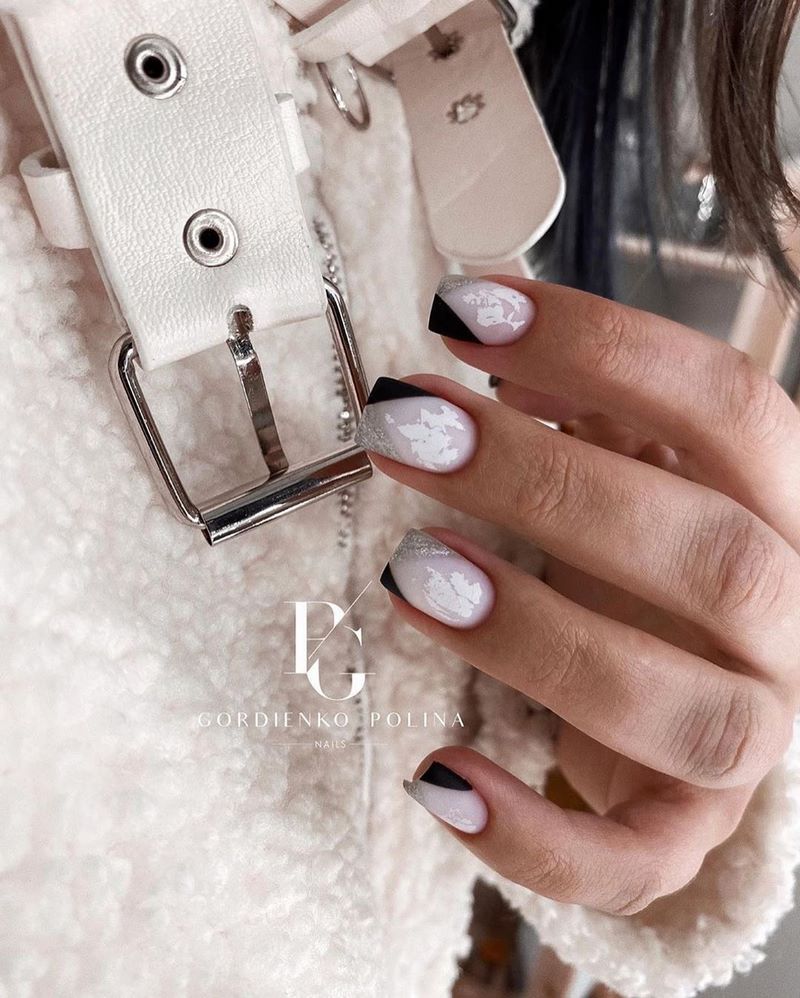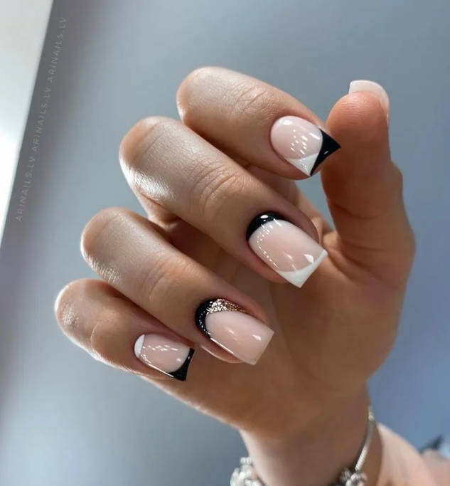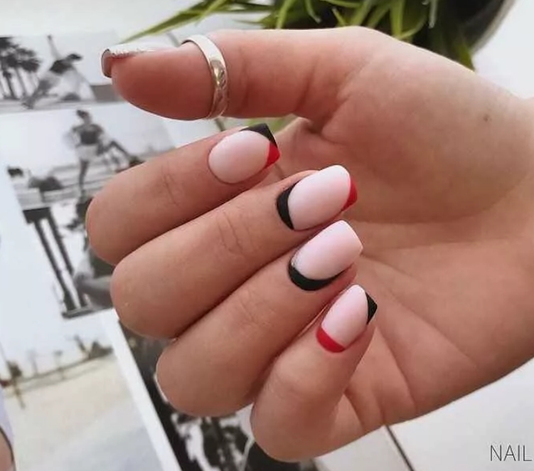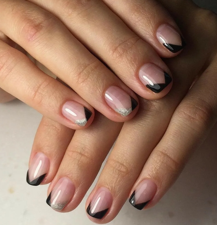 Черный френч выглядит элегантно и эксцентрично. Его обычно предпочитают деловые дамы. В моде классическое сочетание белого и черного. Эти цвета смотрятся очень гармонично. Также актуально будет сделать зеркальное оформление. Черная втирка на нюдовом фоне придаст вашему образу нотку нежности и легкого шарма.
