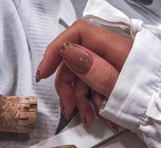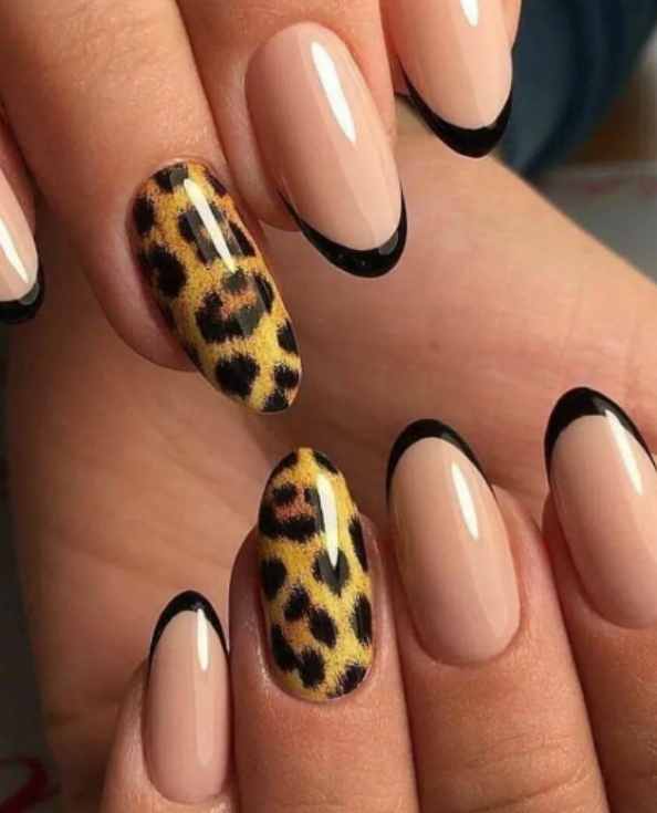 Линию «улыбки» в этом варианте покрывают узором, который напоминает кожу животных. Чаще всего девушки выбирают леопарда, змею, корову, черепаху или тигра. Смотрится такой френч ярко и молодежно. Если вы хотите выглядеть этой осенью неординарно, отдайте предпочтение такому дизайну.