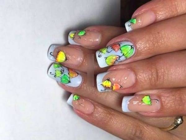Классика осеннего френча – это тематические рисунки. Привычный дизайн прекрасно преобразится с каплями дождя, листопадом, гроздьями рябины или красивыми пейзажами. Повысить эффектность и реалистичность такого дизайна можно с помощью имитации капель воды, которая создается прозрачным гель-лаком.