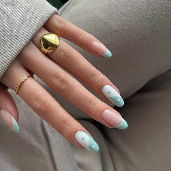Голубой френч завоевал сердца романтичных натур. Это нежный и ненавязчивый дизайн, его любят за универсальность. Он прекрасно сочетается с геометрическими рисунками. В моде зигзаги, ромбики и квадраты. Такой вариант выглядит сдержанно и невероятно круто. Также осенью красиво будет смотреться тандем с «вязаным» маникюром, твидовой текстурой, горошком и витражами.