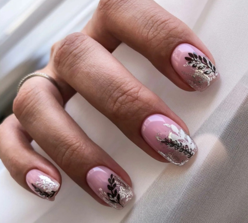Стильно будут смотреться веточки и листья в пастельном или темном лаке. За нотки изящности в этом дизайне могут отвечать легкие блестящие акценты на поверхности листьев.