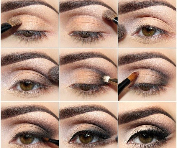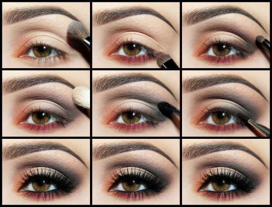 Пошаговое исполнение вечернего макияжа для карих глаз представлено на фото:
