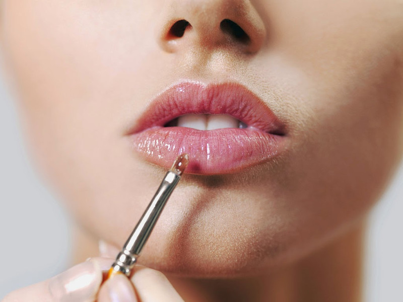 На выпуклые части губ наносят более светлую помаду. Затем поверх наносят блеск. Многие выбирают блески с глиттерами или серии «хамелеон», но подойдет и приближенный к помаде вариант.