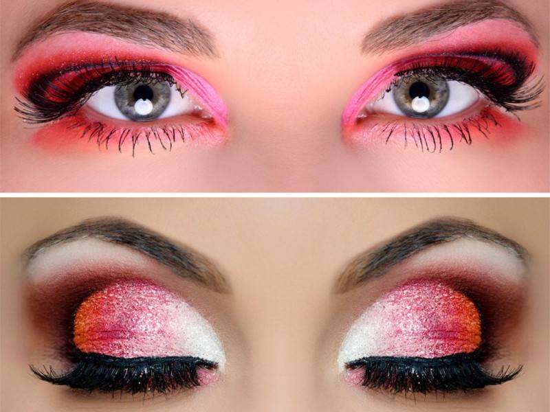 Для вечера используют яркие тона и блестки. Дневной макияж делают естественным. Если акцент ставится на губах, то для век не используют кричащие тени.