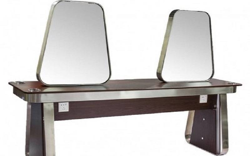 Из дорогостоящих предложений можно отметить изделия от Китайской компании Мирвуд Твин. Можно приобрести современное изделие в необычном дизайне за 45-53 тысяч рублей. Например, модель за 53 500 рублей – это красивое изделие с двумя двухсторонними зеркалами и длинной столешницей. За таким оборудованием смогут работать одновременно четыре мастера. Очень удобно для парикмахерских с большой проходимостью. Подобная установка выполнена качественно: металлическая крепкая основа покрыта антикоррозийным составом. Стол сделан из металла и ЛДСП. Такая мебель прослужит долго.
