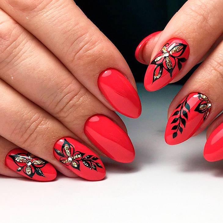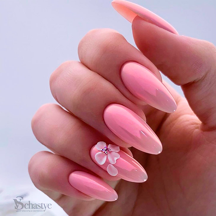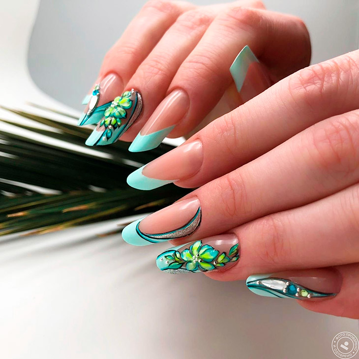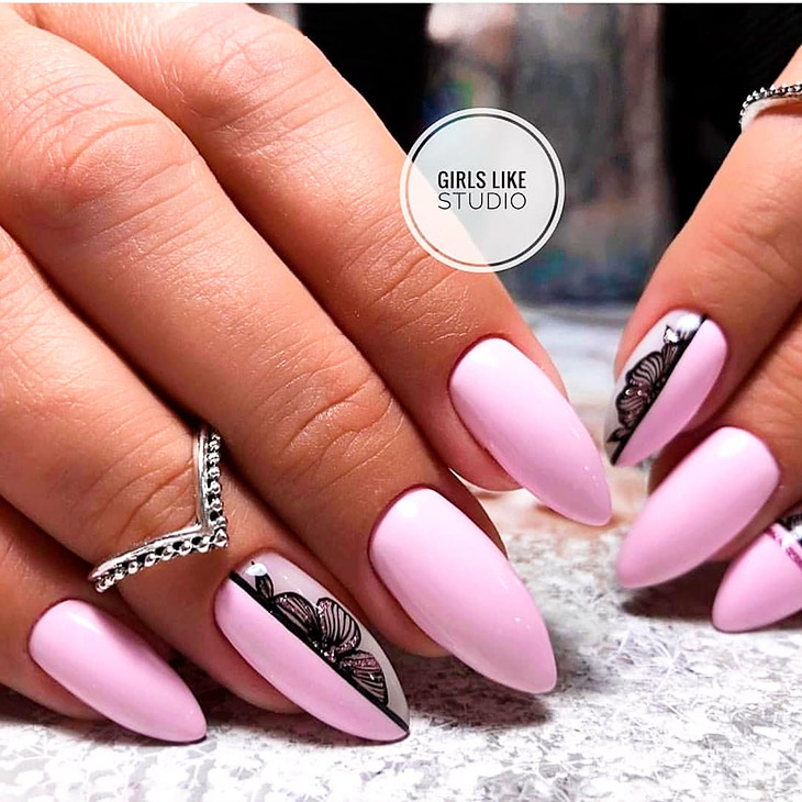 Овал можно назвать идеальным фоном для выполнения любого рисунка. Это может быть как примитивный принт, так и настоящий художественный шедевр. Цветы, нарисованные на таких ноготках, смотрятся невероятно нежно и натурально. Для тех, кто сомневается в своих художественных способностях, специально созданы тематические наклейки, трафареты и стемпы.
