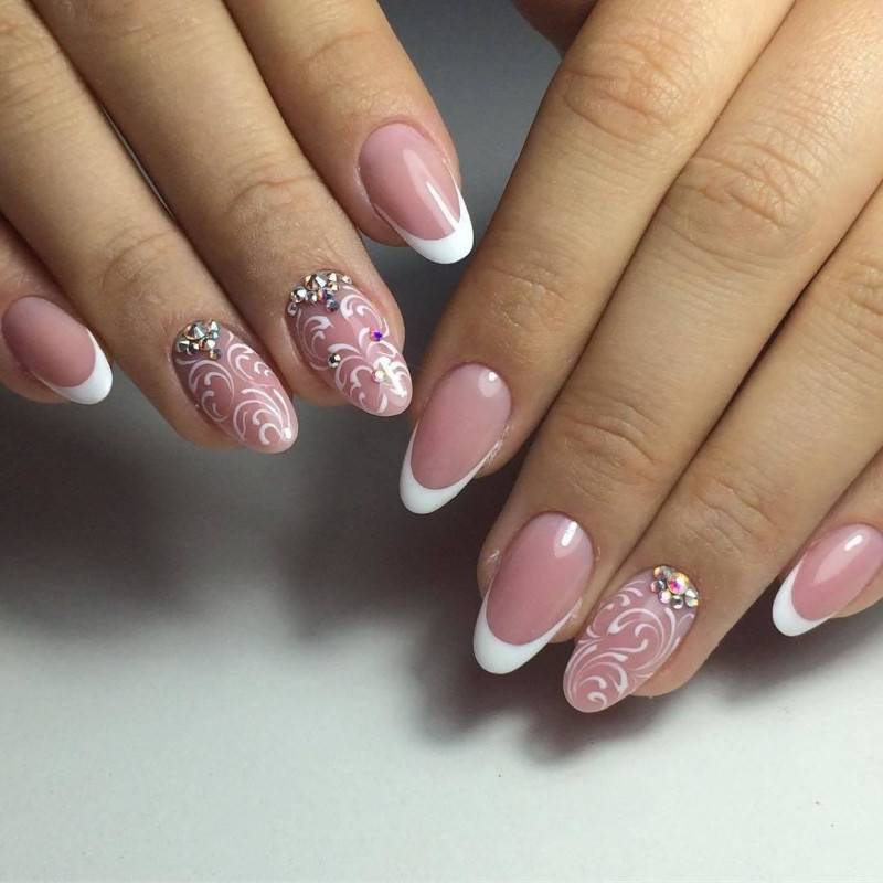 Считается, что умеренная длина овала идеальна для френча. К тому же, её в достатке для любого декора, и ногтевые пластины меньше склоны к расслаиванию и сколам. Французский маникюр подходит просто безупречно.