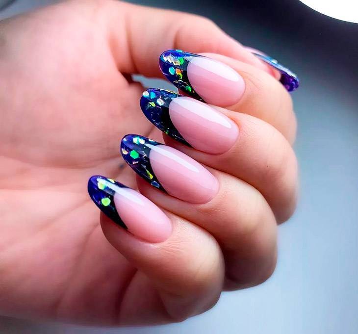 Также выбор можно сделать в пользу классического или микро френч-маникюра, например, черного, красного или бордового – такой дизайн всегда актуален. Французский стиль можно добавить минималистичными рисунками, выполненных самостоятельно или при помощи стемпинга. Также сочетание блесток и темного лака идеально подходит как для коротких ногтей, так и для длинных овальных ногтей. Когда длина позволяет, можно экспериментировать и оттенками лаков, и с модным дизайном.