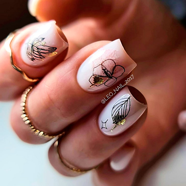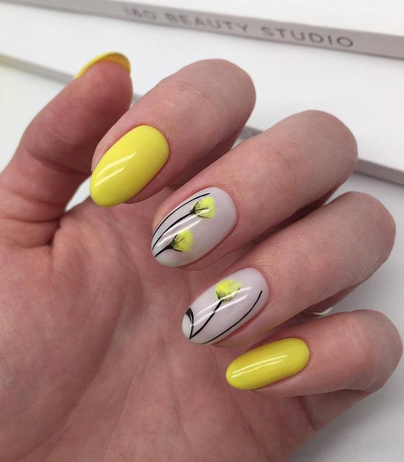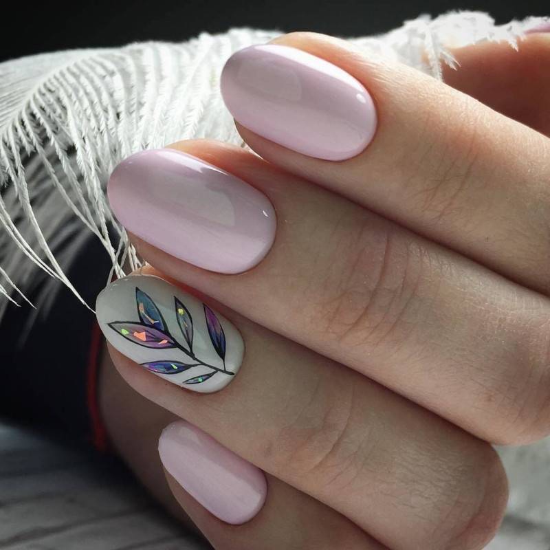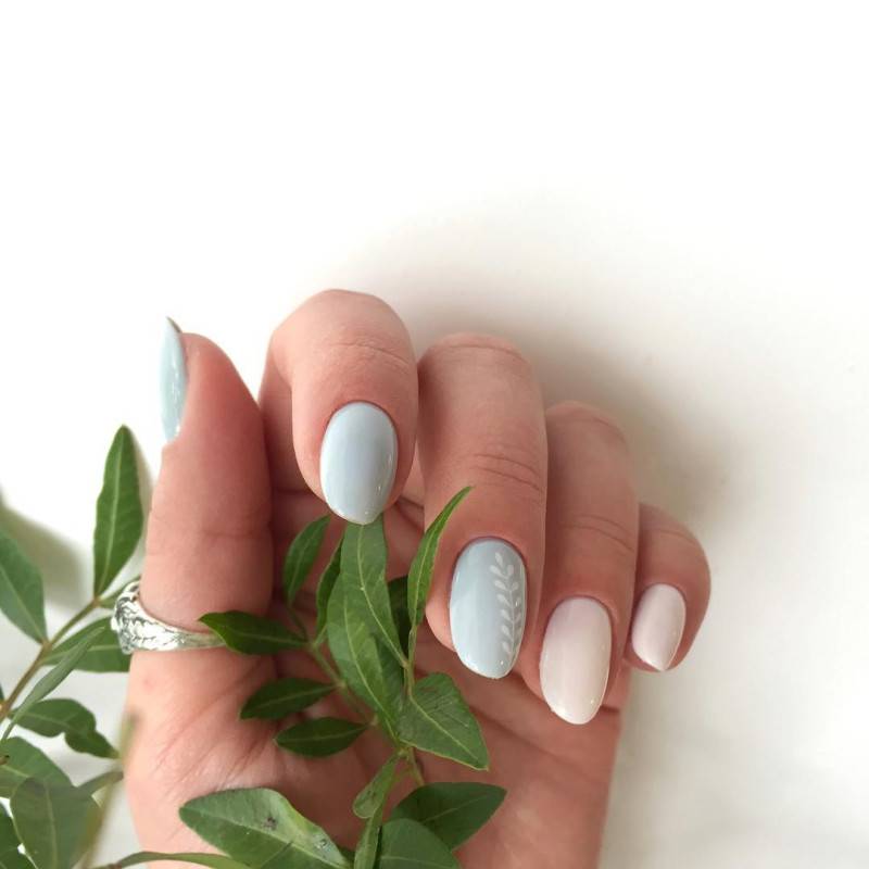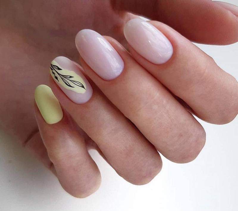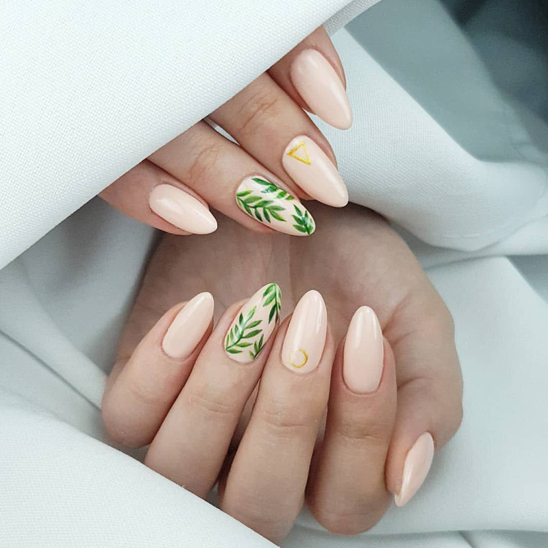 Стильный маникюр на овальных ноготках может выглядеть совершенно по-разному. Кто-то предпочитает нейтральные, лаконичные веточки в качестве единственного рисунка. Такой вариант – идеальное решение в повседневной жизни. Поскольку он будет хорошо сочетаться буквально со всем. В то же время, более яркие рисунки в виде зеленых листьев и бутонов цветов – всегда являются идеальным украшением для овальных ноготков.