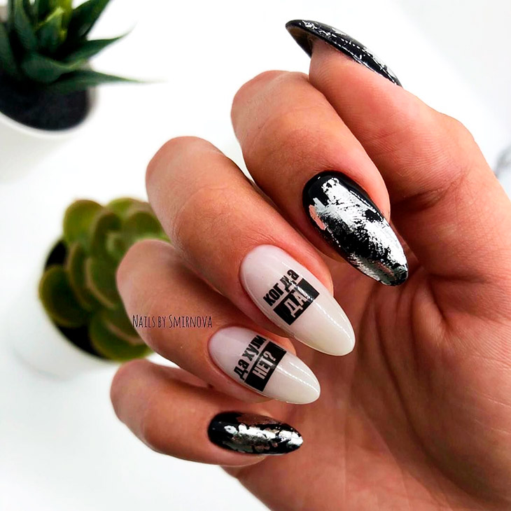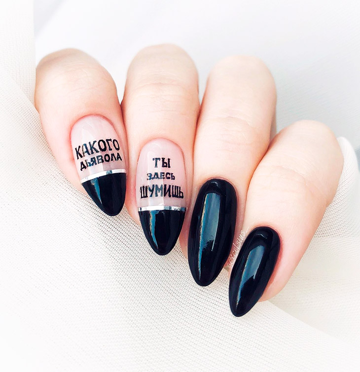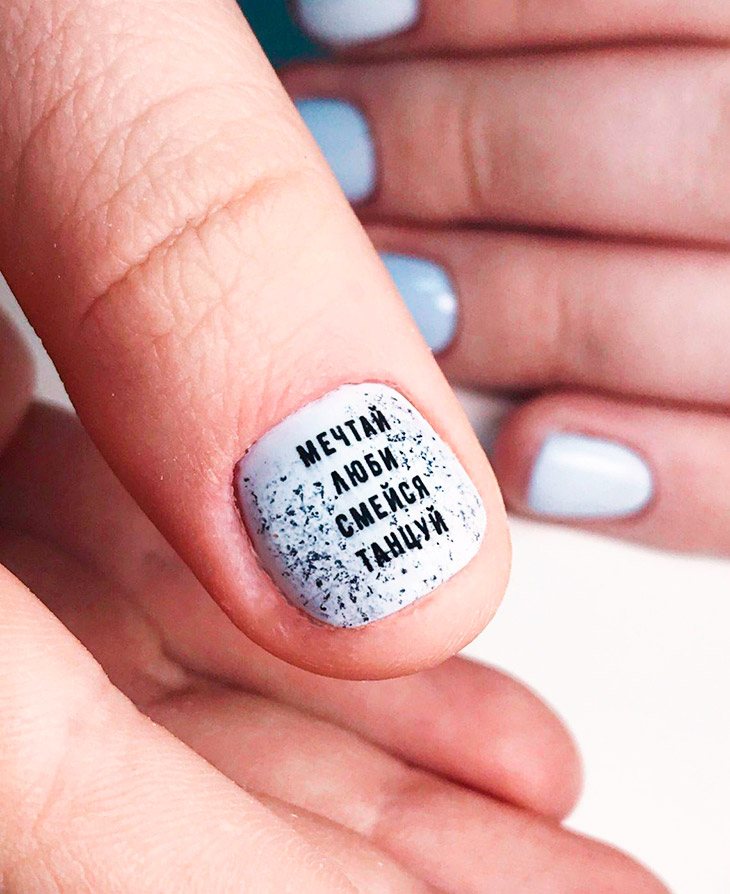 Нельзя не отметить надписи, как один из самых трендовых дизайнов 2020 года. Они могут быть мотивирующими, шутливыми или же особенными для вас. Независимо от выбранного варианта такой маникюр всегда смотрится необычно, интригующе.