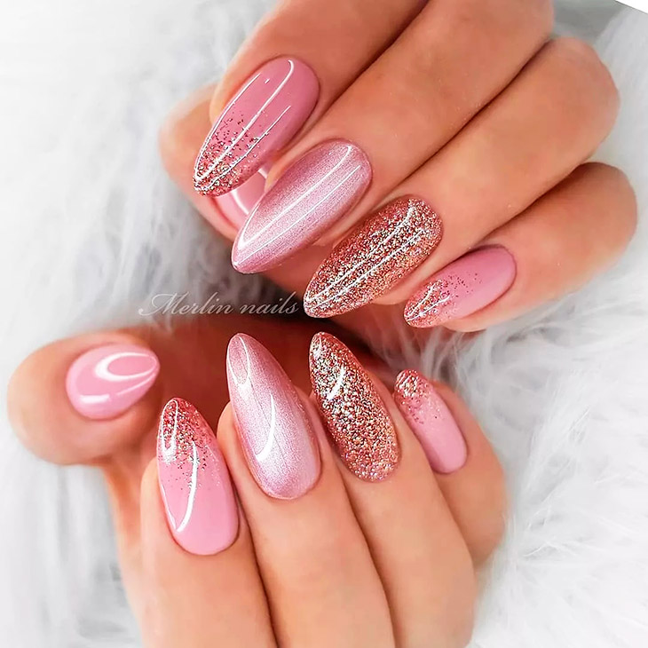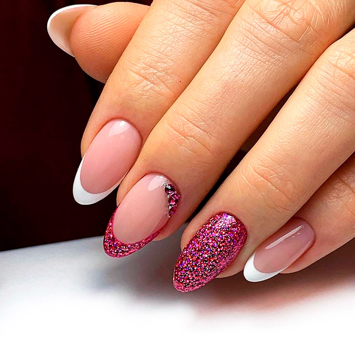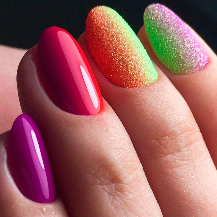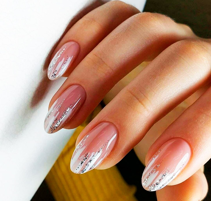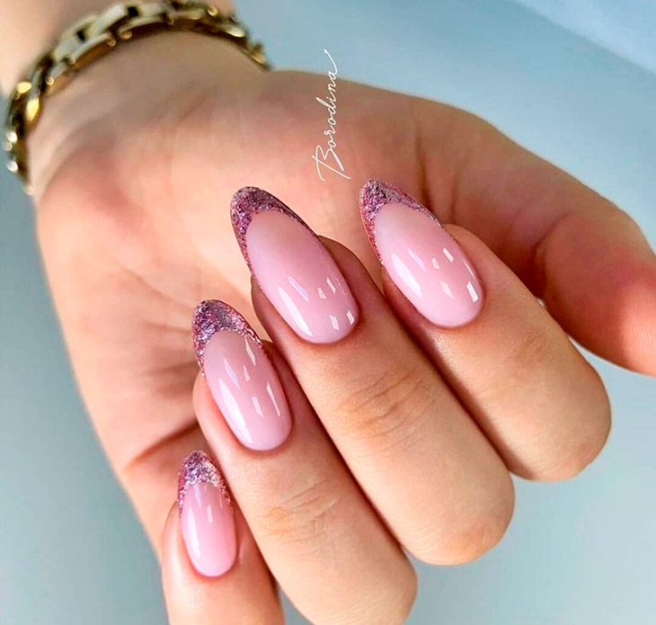 Овальный маникюр с присыпкой будет хорошо сочетаться с любым цветом, поскольку это декорирование. Однако не стоит «засыпать» все ногти, расставляйте акценты.