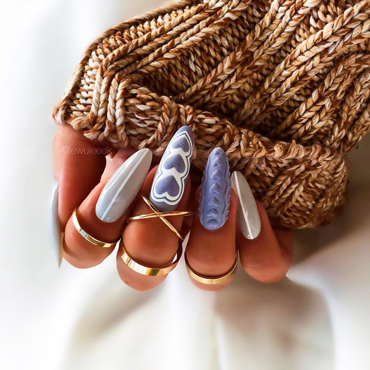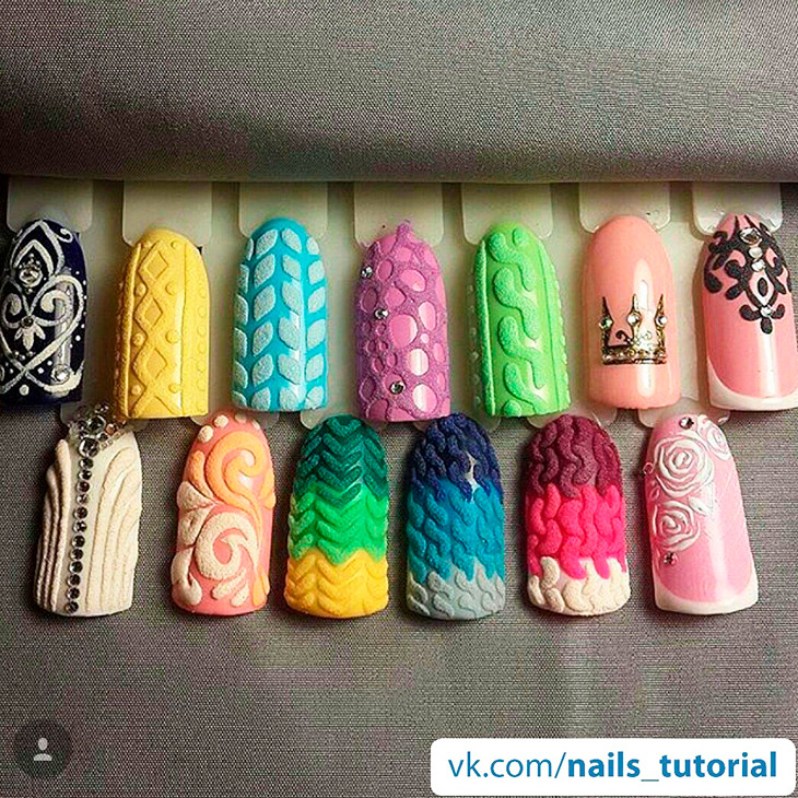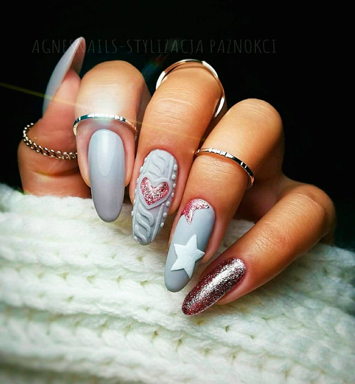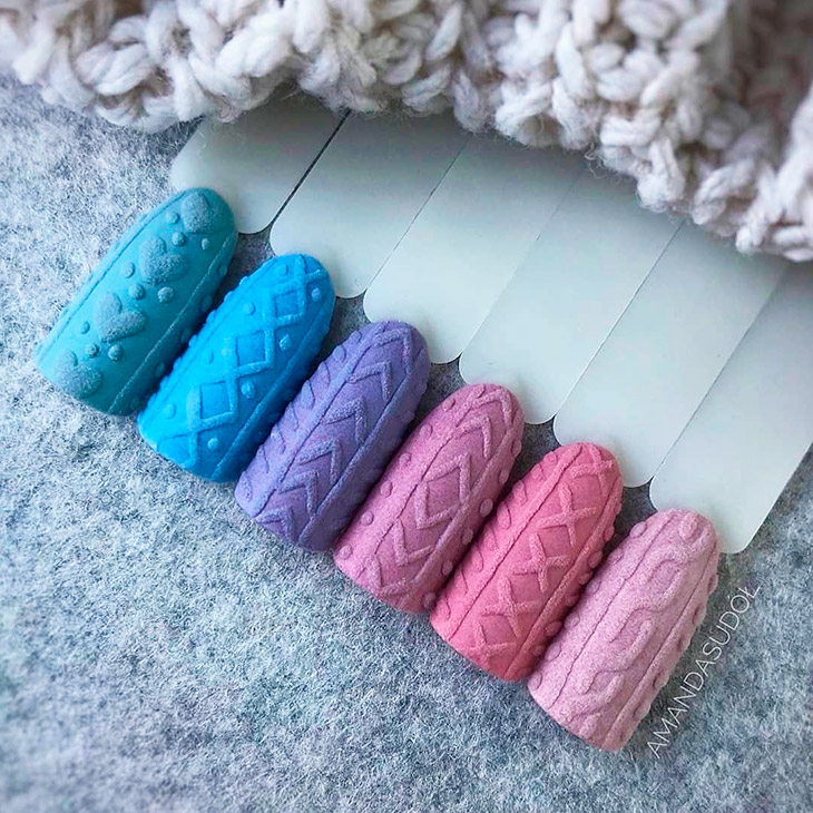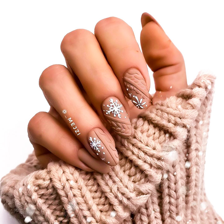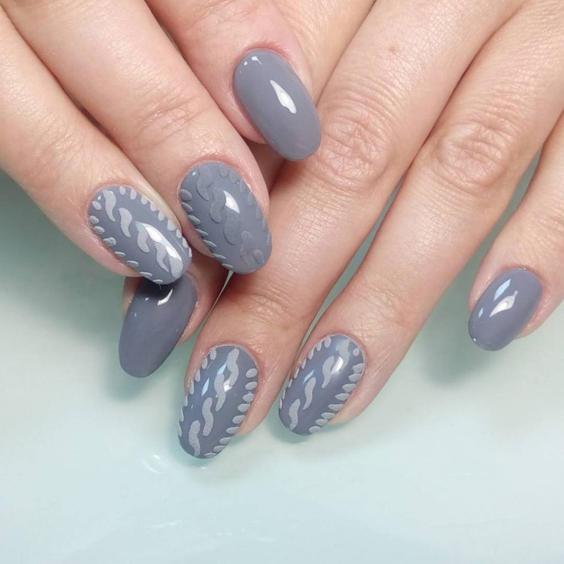 Совершенно не рекомендуется делать вязаный свитер, поскольку тренд уже устарел. Но, тем не менее, дизайн на овальных ногтях выглядит весьма уютно.