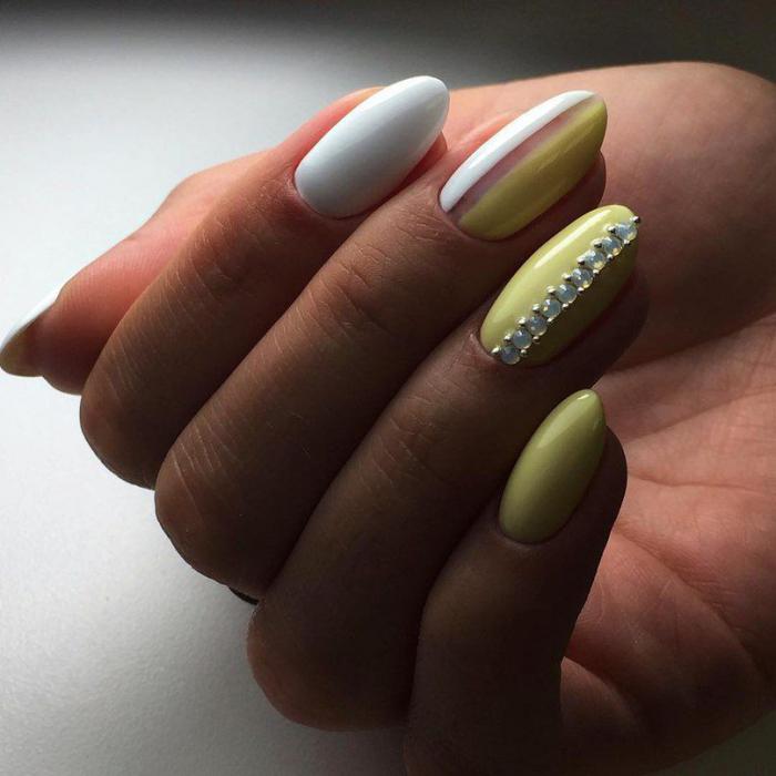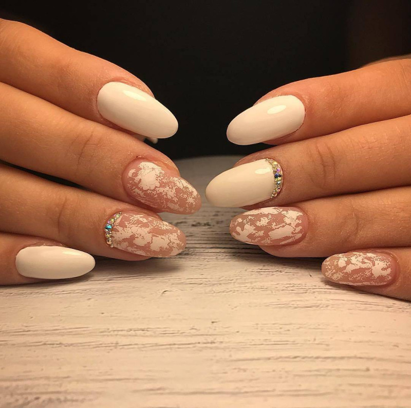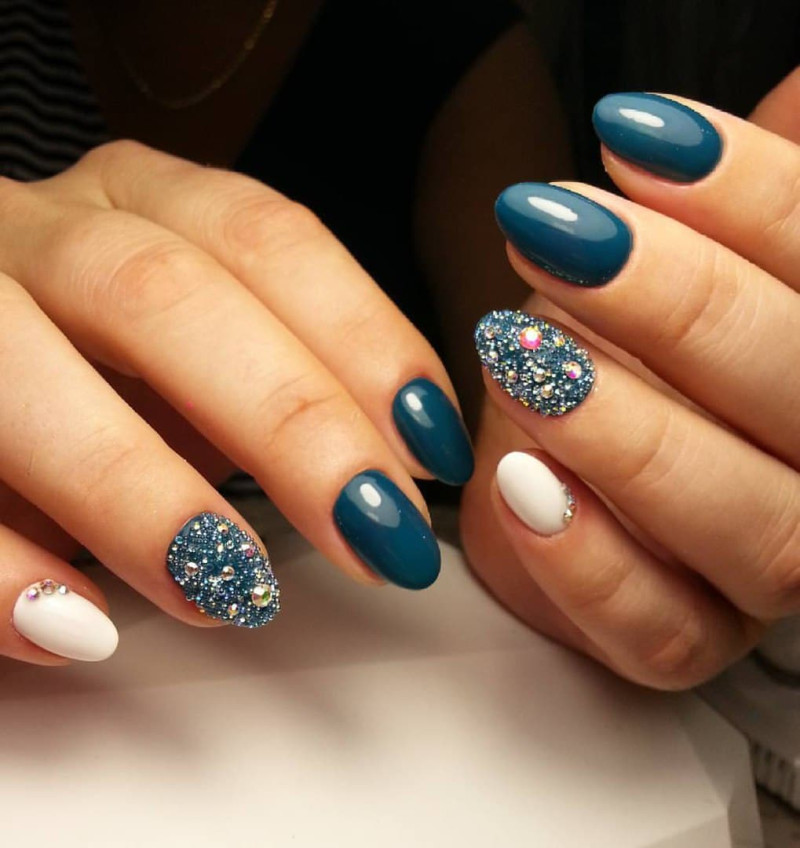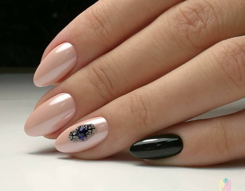 Стразы оживят любой дизайн, но и тут главное не «переступить» границы разумного. Лучше всего украсить овальные ногти около кутикулы.