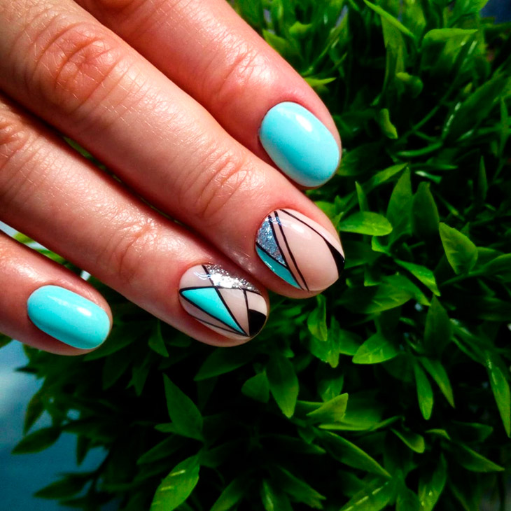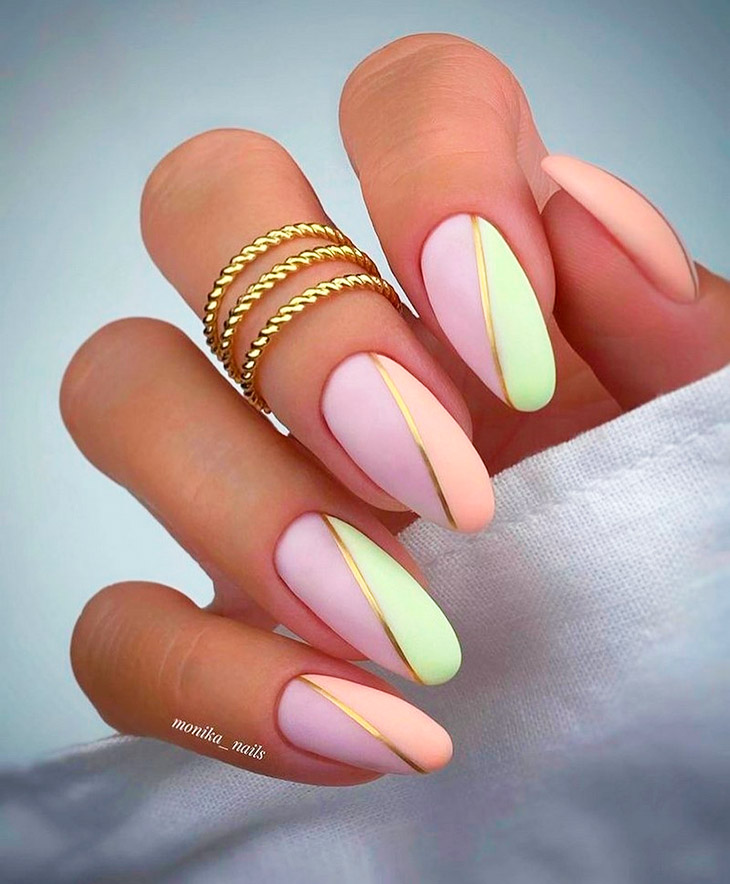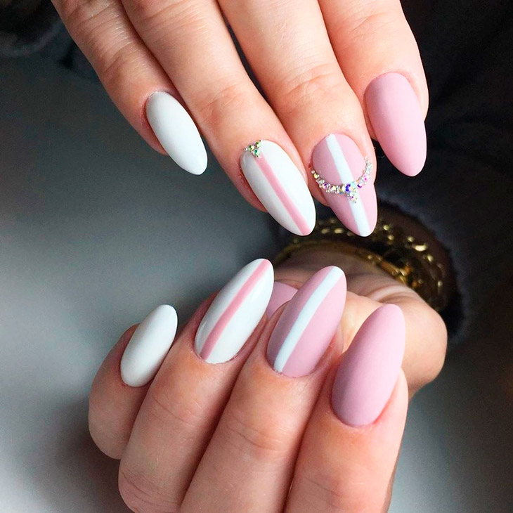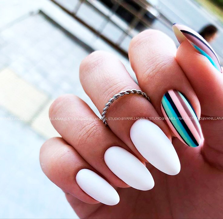С одной полоской, овальная форма сочетается лучше, чем с несколькими. Такой вариант дизайна хорошо подходит для добавления в пастельные тона красок. К примеру, на персиковом провести мятную линию.